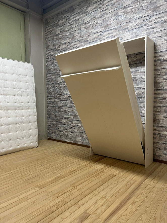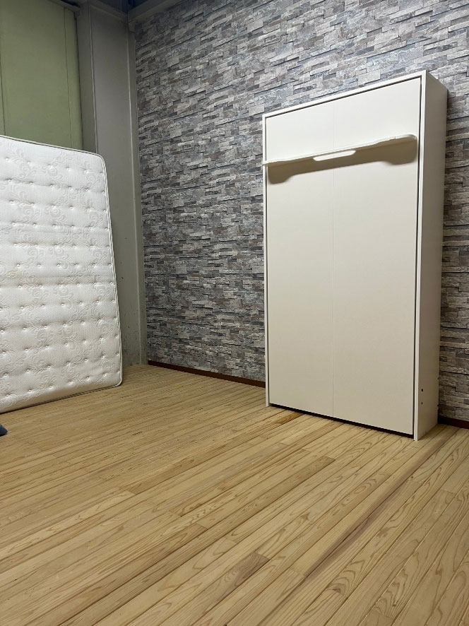 千葉県市川市にて、標準品格納ベッドシングルホワイト横及び縦、見せるベッド縦型ホワイト、を展示しております。