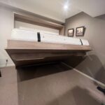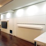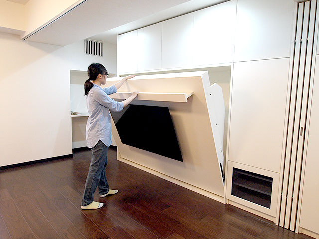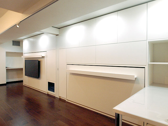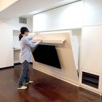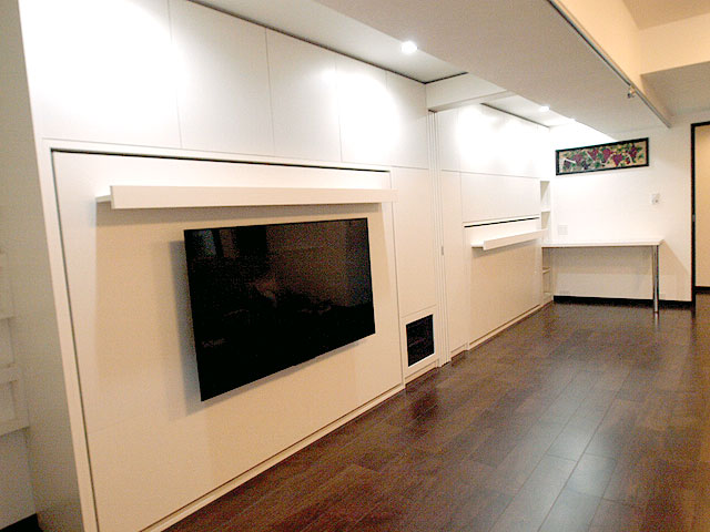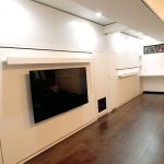 ベッドのフレームの中には、TV配線が沢山実は隠れています。その中をとおりベッド右側のTVラックに配線がつながるようになっています。モニターの重さを考慮して、格納ベッドの金具も強度を増して製作しています。これも緻密な作品となりました。