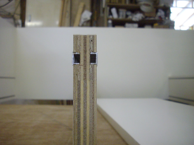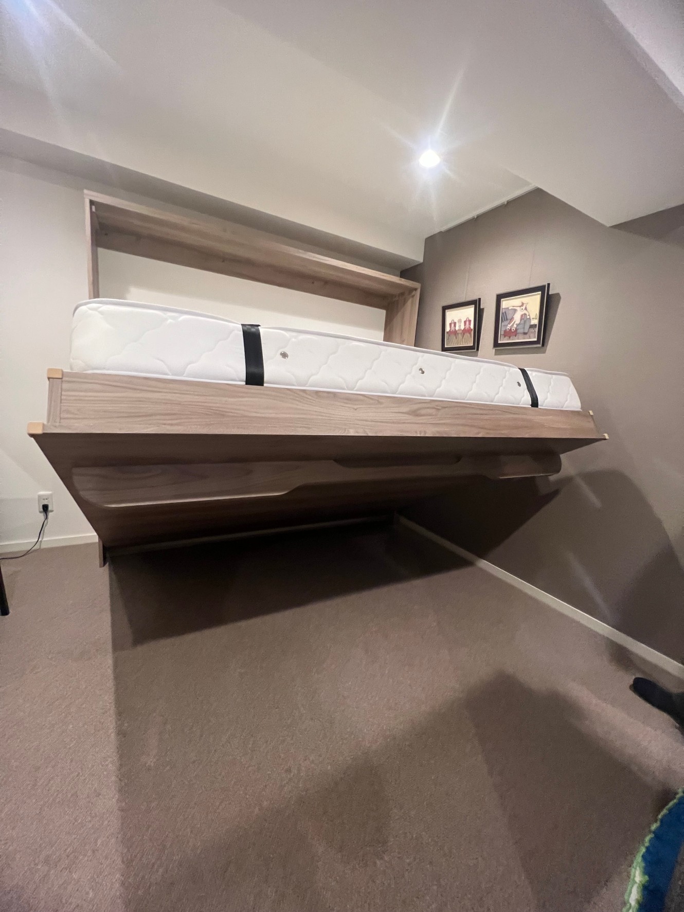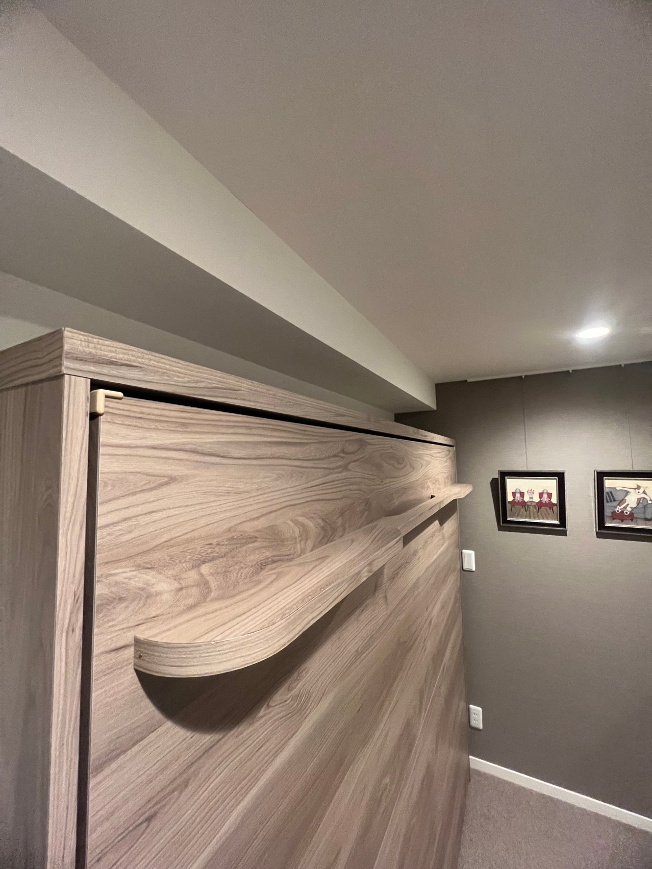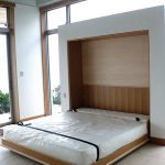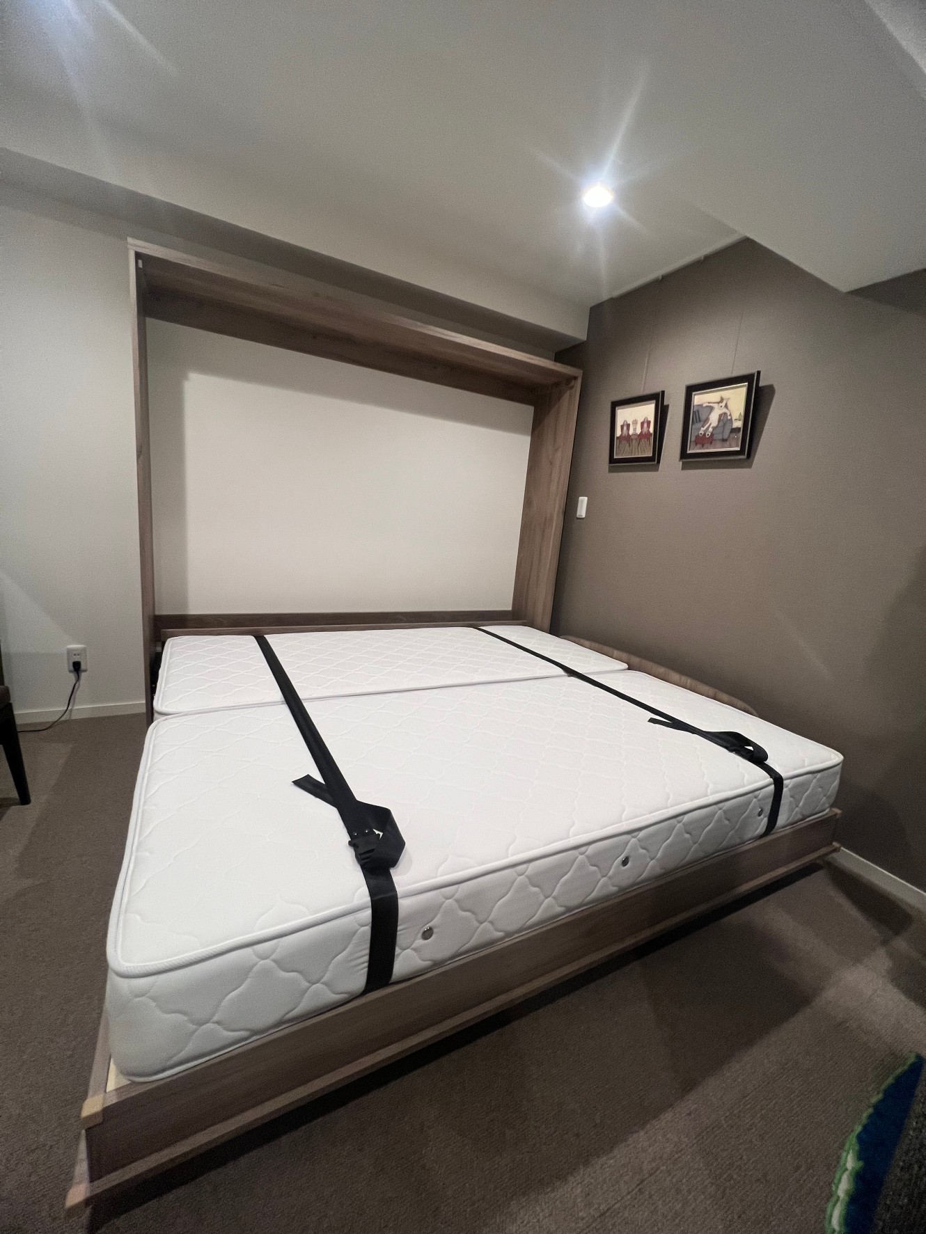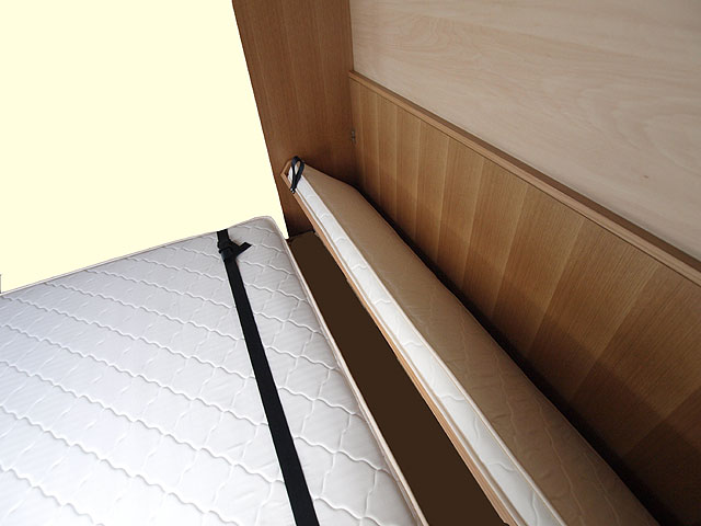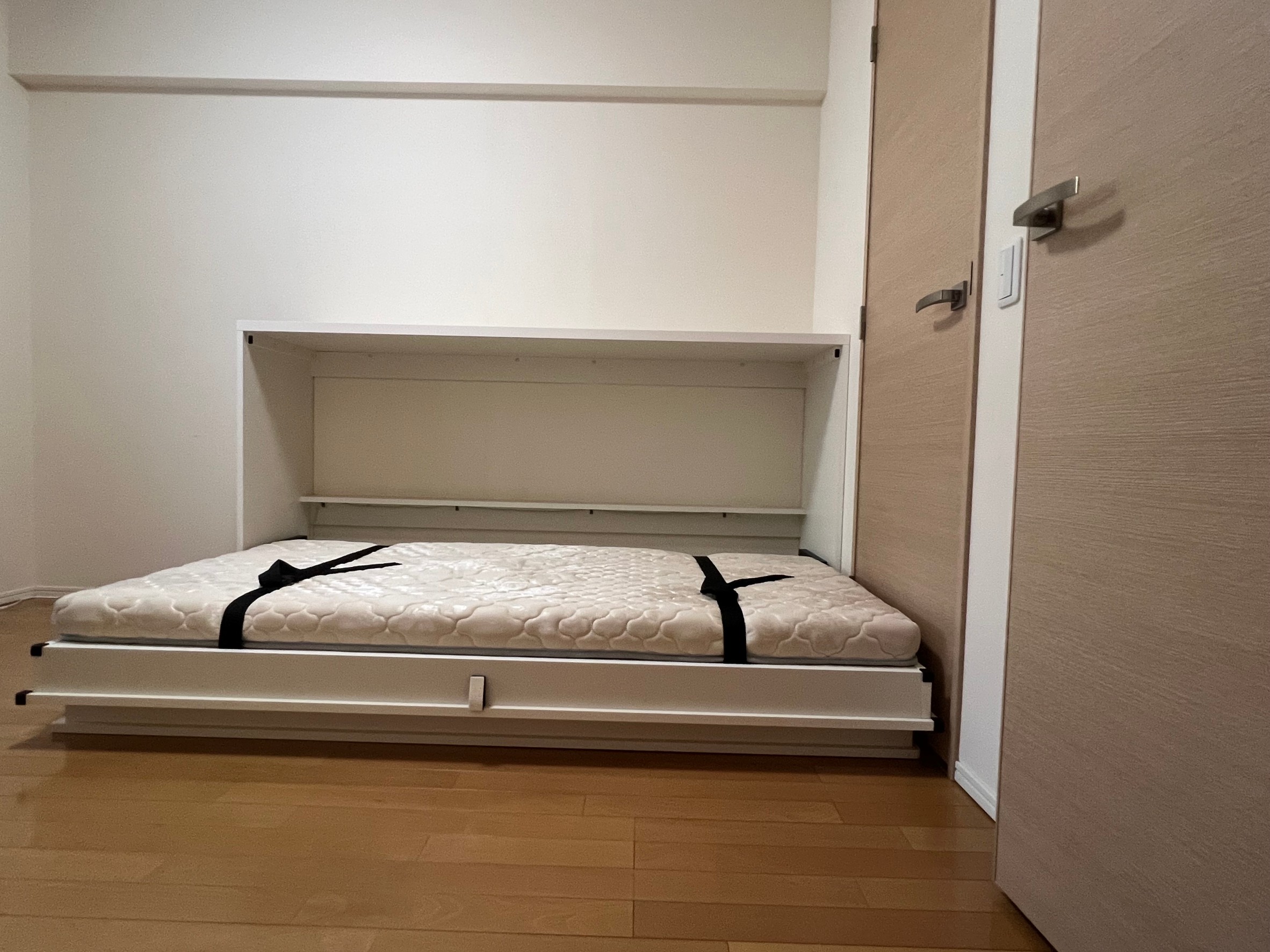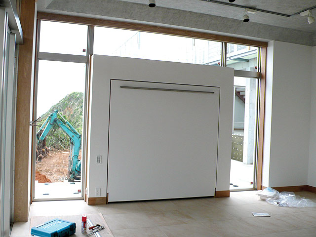 ご主人様からの電話で随分前に、クイーンサイズでのお問い合わせでした。クイーンサイズは、大柄な方で止む無くクイーンにせざるをえないような場合は仕方ありませんが、今回の場合はダブルのほうをお勧めしました。格納した面に収納棚を作りたいとのことで、棚柱の取り付け方法や、こぼれ止めの加工など工夫しました。