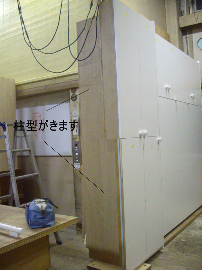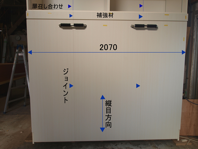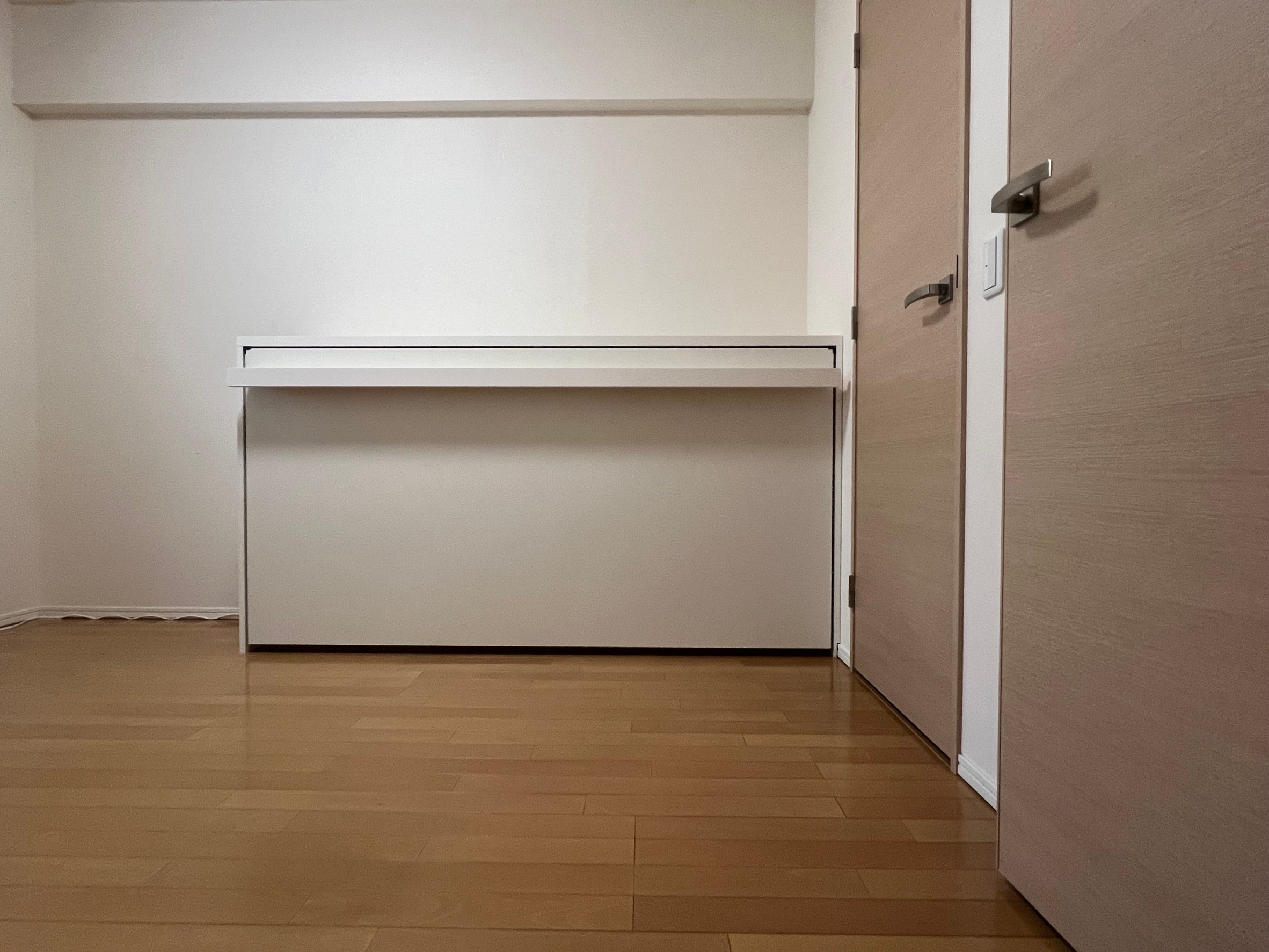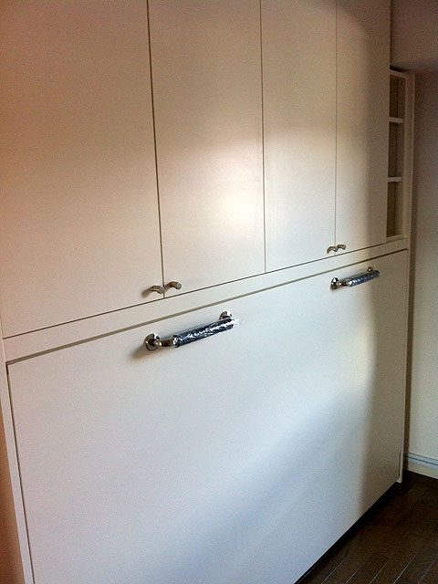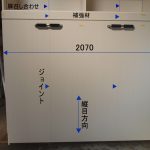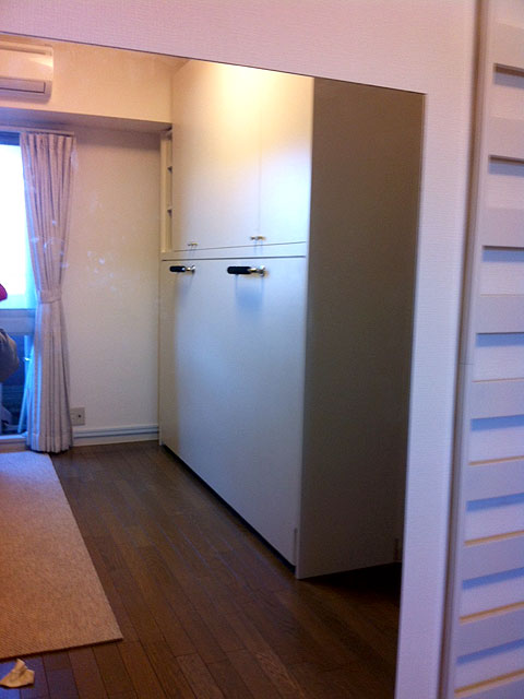 一番も問題は引手ハンドル兼脚の納まりです。設置では、お部屋自体が2.5畳ほどしかなく、組み立てた状態では設置はできず、一度分解をして設置をしました。