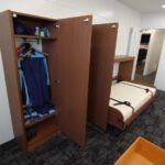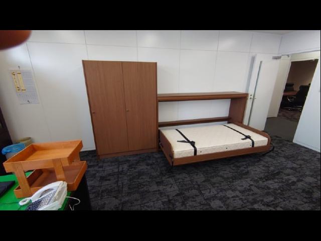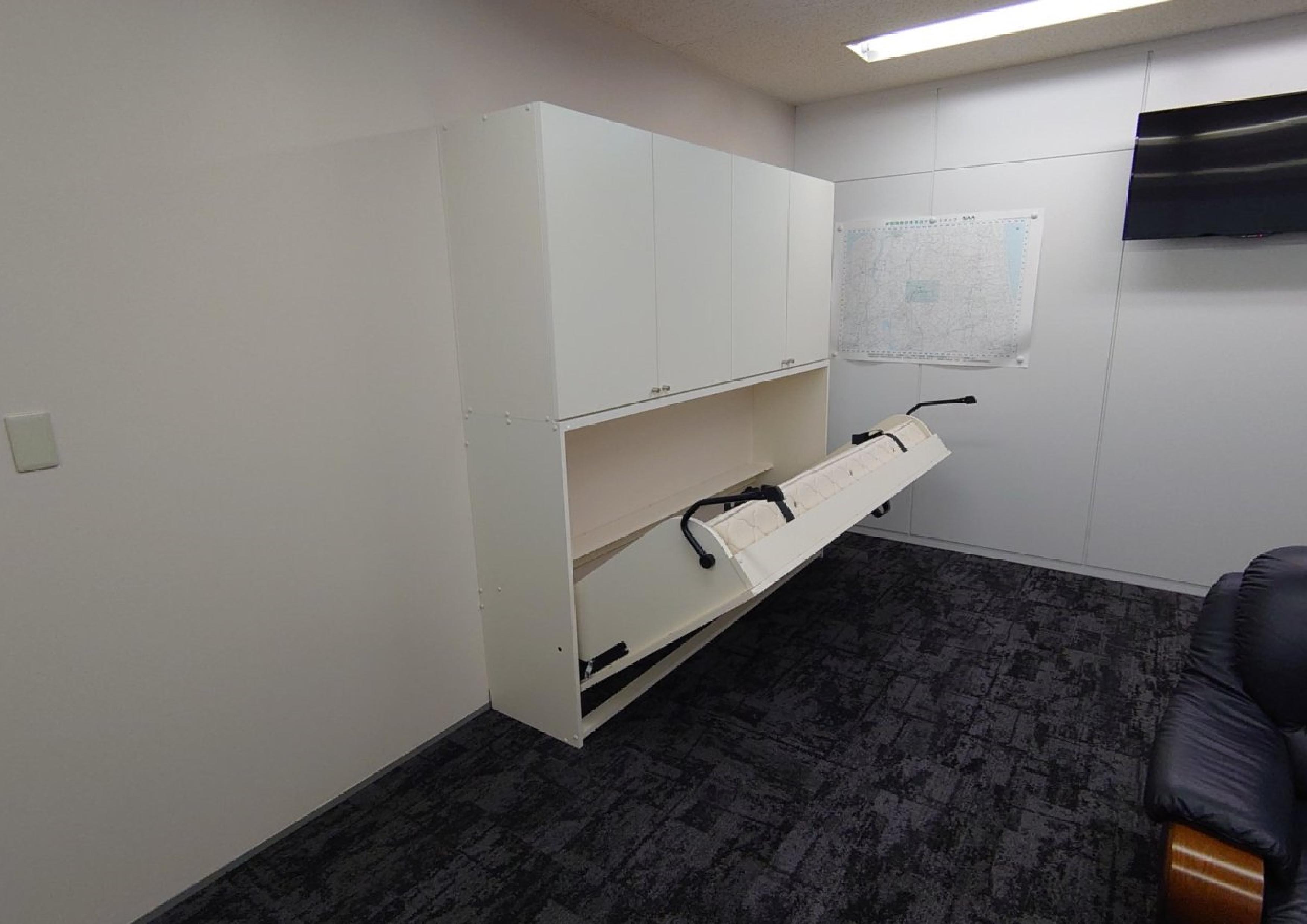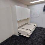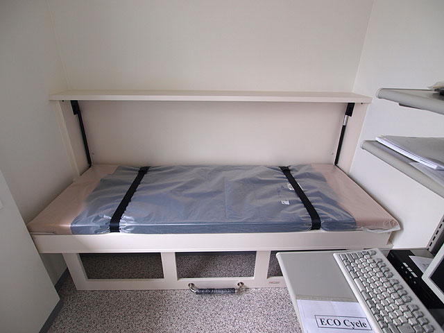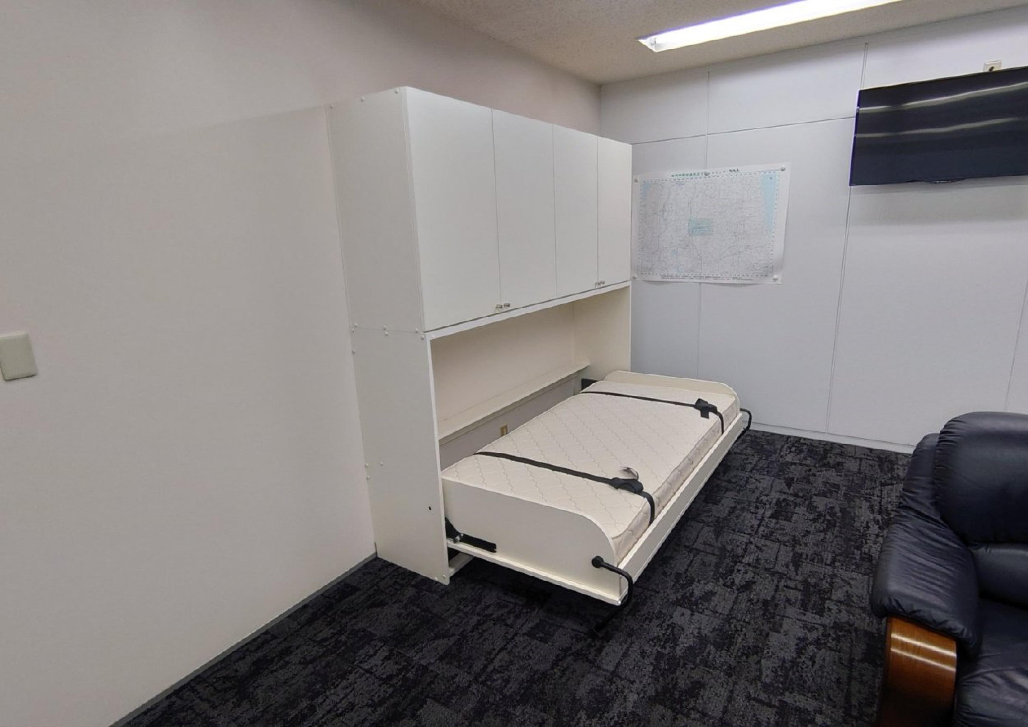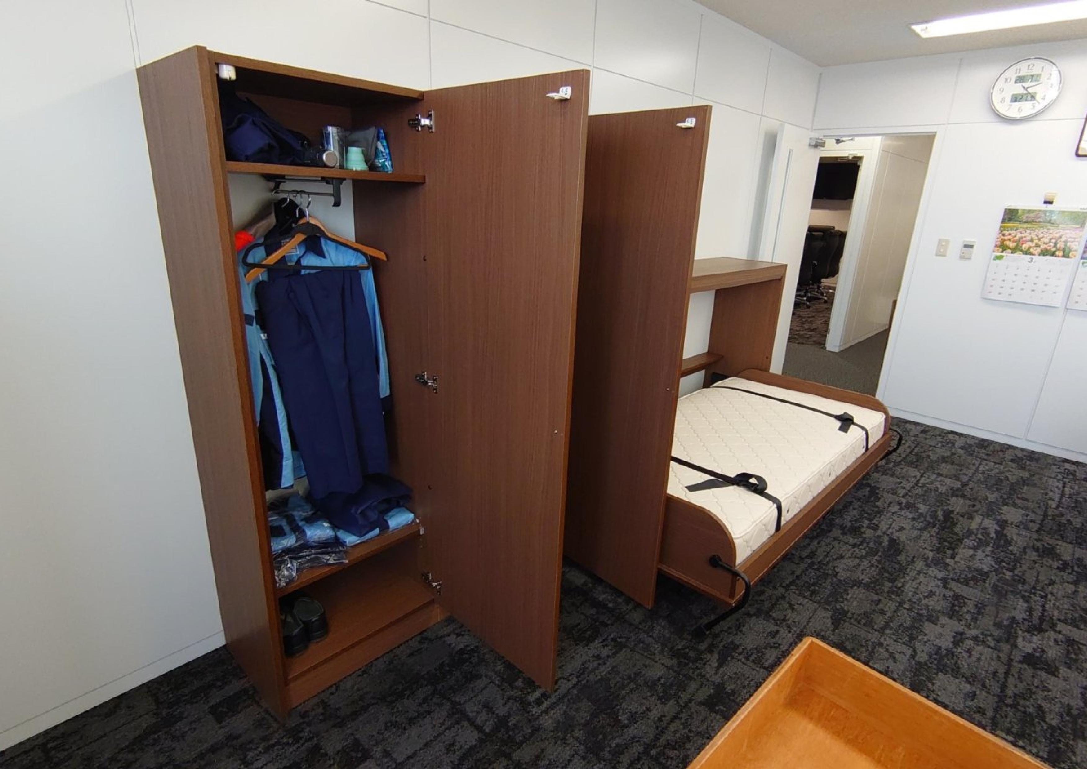 昨今の、大雨や台風の影響で、緊急対策用に企業の格納ベッド設置事例が増えております。このお客様も、社長室と専務室に、格納ベッドと収納を設置させて頂きました。