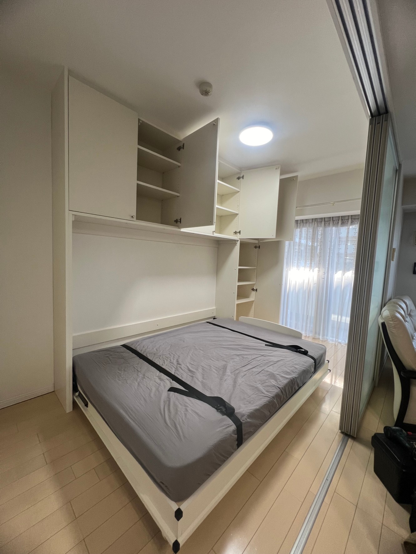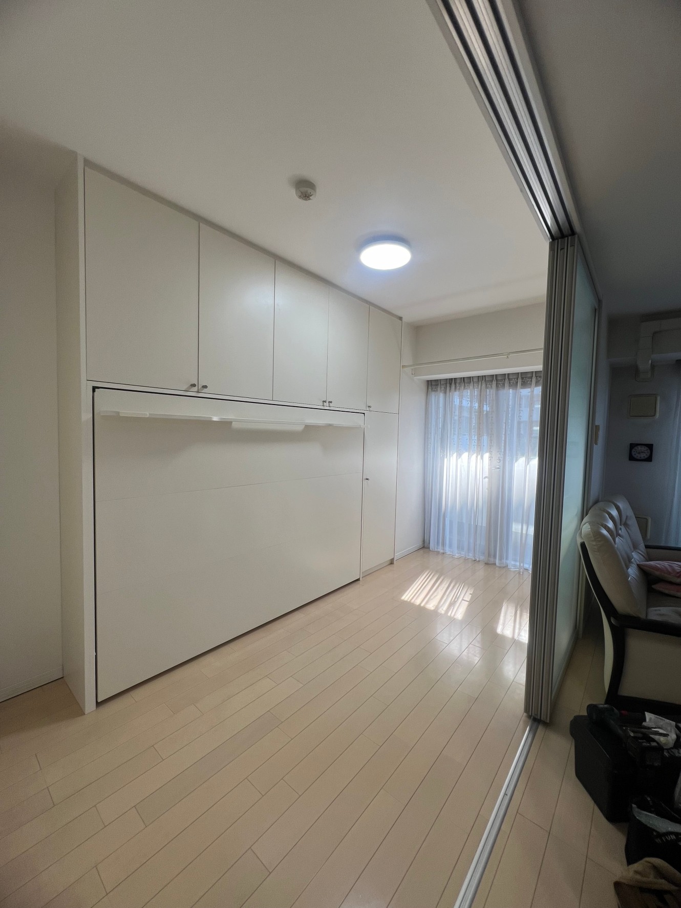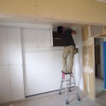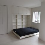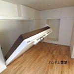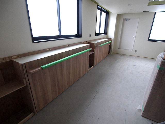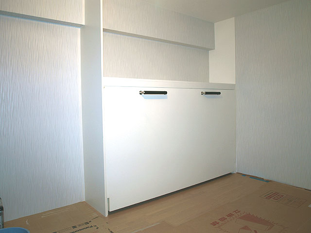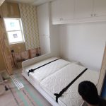 奥様からのメールでのお問い合わせが一番最初でした。本来は、全ての内装終了後に、設置を行うのですが、お部屋が4畳でしたので、壁面を作ってしまった後では、搬入もままならないので、元請様のご協力で、ベッドと壁面収納を先に設置させて頂きました。柱型がありましたので、元請様のミリ単位での現調のおかげでぴったり納めることができました。