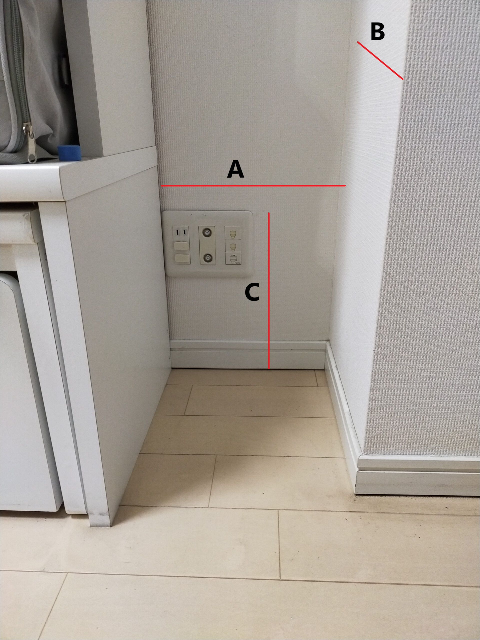 横型ダブルのベッドを設置をしたいけれど、周囲の収納もつけたく、その場合、右下にコンセントやインターネット回線があり、それを使える形で、収納を作りたい、というお問合せでした。壁面のどの位置にそれらがあるのかを事前に情報を頂戴し、たたき台の図面を作成しました。最終的には、お客様と弊社がイメージしていることが一致している必要があるため、現調に伺いました。