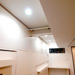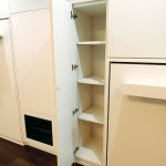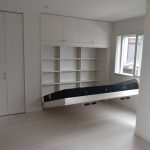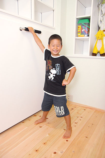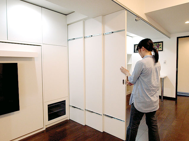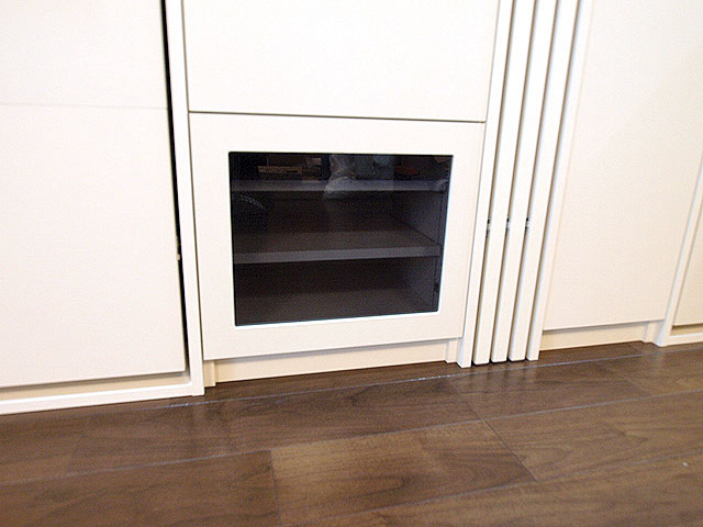 このお客様は、昼間はピアノ教室として奥様が使用して、夕方から夜は、お子様の子供部屋として使用されるということで、お子様の頭にぶつからないようになどの配慮から、引手ハンドルは小ぶりで目立たないものを使用しました。上部には耐震ラッチつきの収納をつけました。