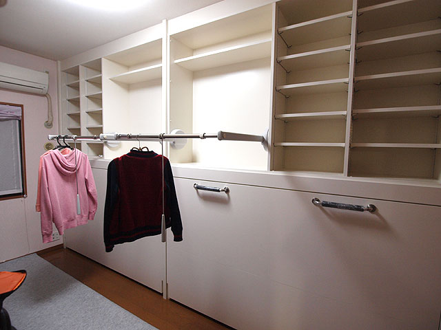 女のお子様二人で、6畳の部屋をお使いになるとのことで、既存の机もあるとのこと。女の子は洋服の数も多いので、上部収納にリフトハンガーを希望されました。ところが、部屋が細長いので、圧迫感を減らし、机にも干渉しないようにすると、ベッドも奥行を小さくせねばならず、必然的に、リフトハンガーを隠す収納扉をつけることができず(扉をつけると収納ができないので…)、扉はつけないことにしました。