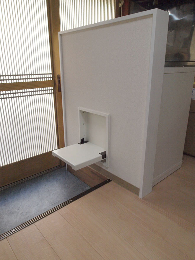 娘様からのお電話で、リフォームを伴った格納ベッドの依頼でした。現場に出向いてみますと、高齢のお母様の生活機能を全て1階にまとめたいとのことで、給排水・電気・大工工事全てこちらでやりました。壁面有効寸法が足りず、ウレタンマットレスもお母様の身長にあわせて必要限度の長さに丈つめし、格納ベッドよりは、リフォーム工事のほうがボリュームがありました。玄関の格納椅子、ペットドアも納めました。
