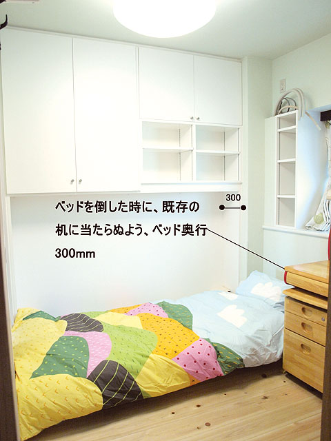 子供部屋約5畳にあわせ、ベッドオープン時の通路幅の確保・勉強机とぶつからないようにする事等を考慮し、奥行320に決定。布団を一緒に格納するには、奥行き狭いので、マットレスは既存の50mm厚を使用。